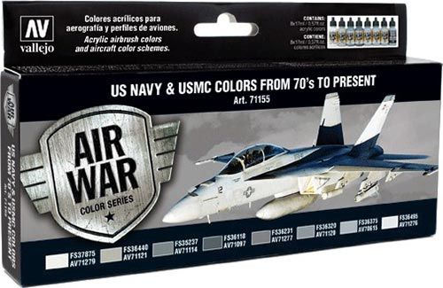 Sada 8 farieb Model Air na maľovanie farbných schém bojových lietadiel US NAVY a USMC slúžiacich od sedemdesiatych rokov do súčasnosti. Sada obsahuje odtiene pre profily lietadiel a vzory kamufláží ktoré nakreslil Mark Rolfe. V spolupráci s "Pieza a Pieza"